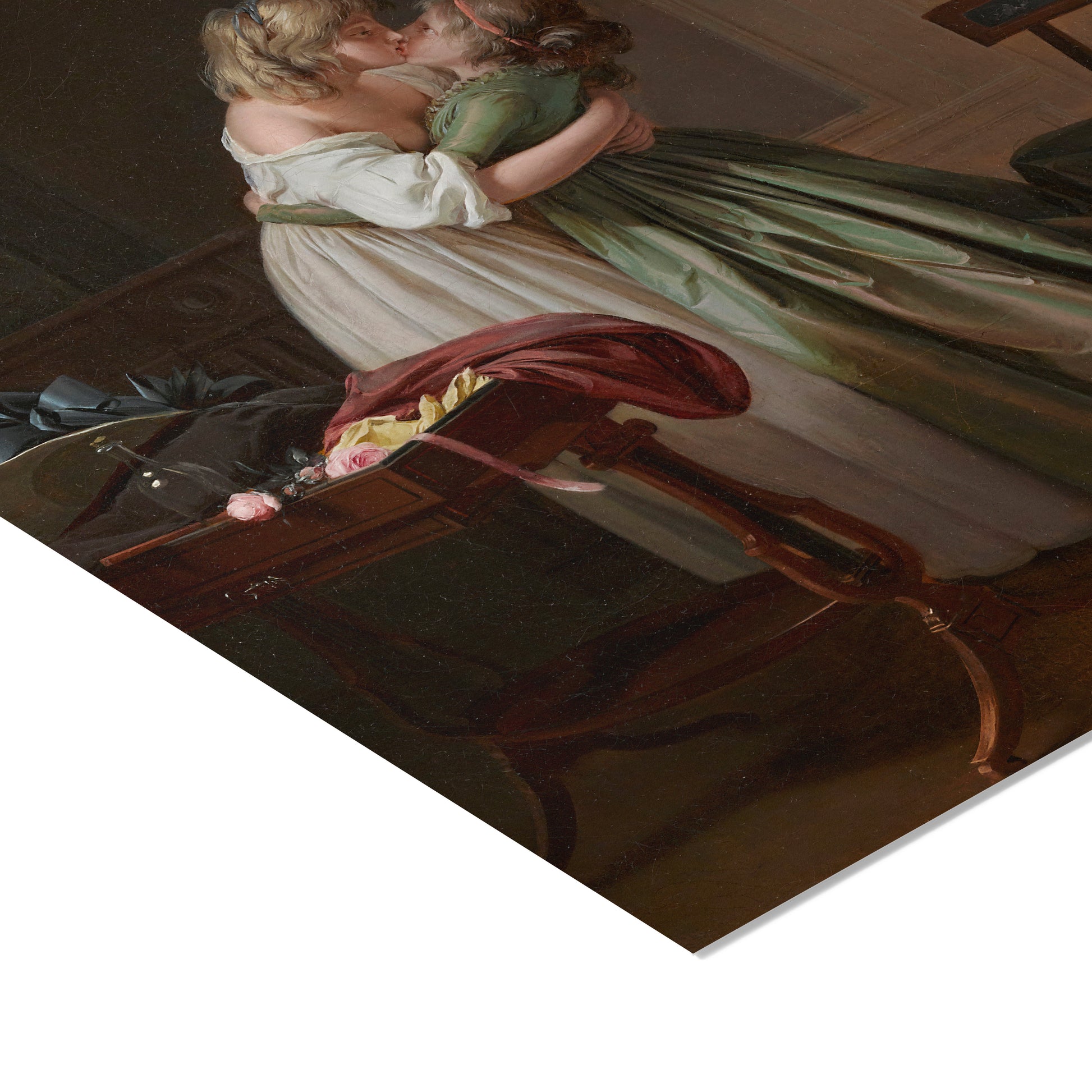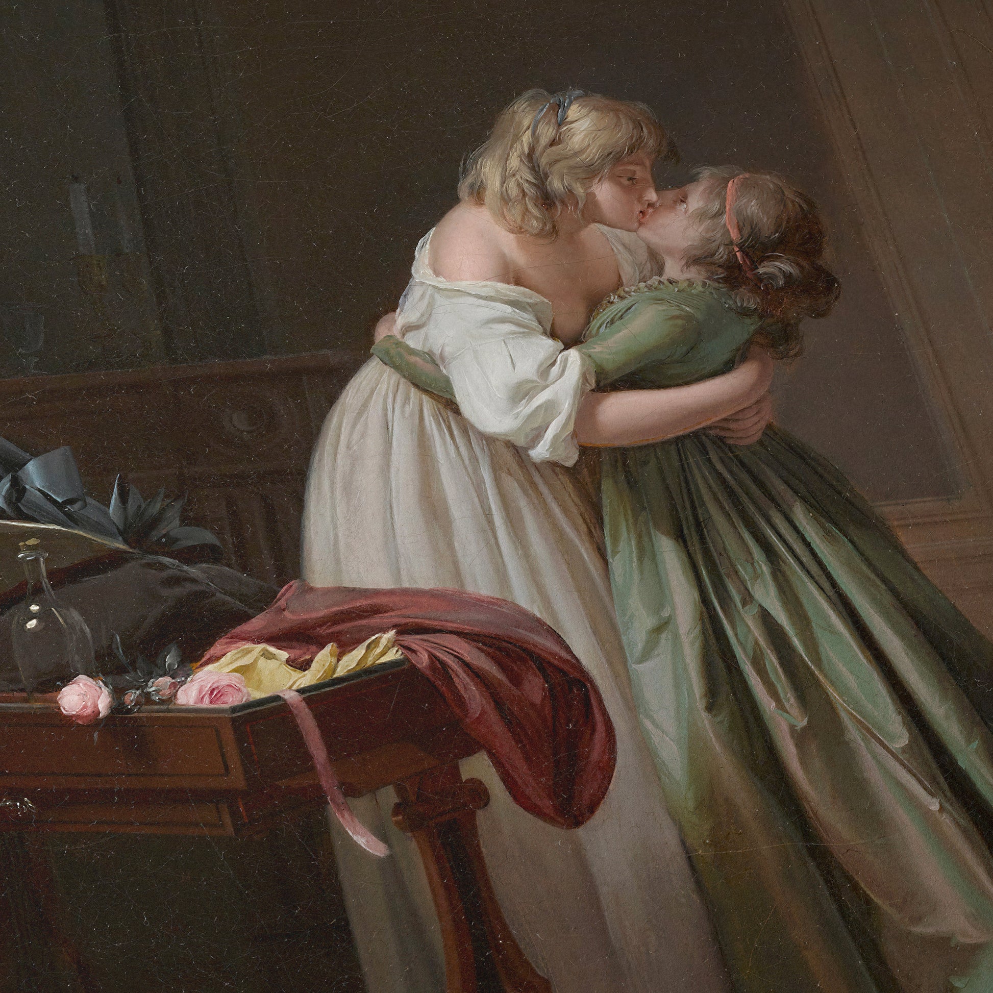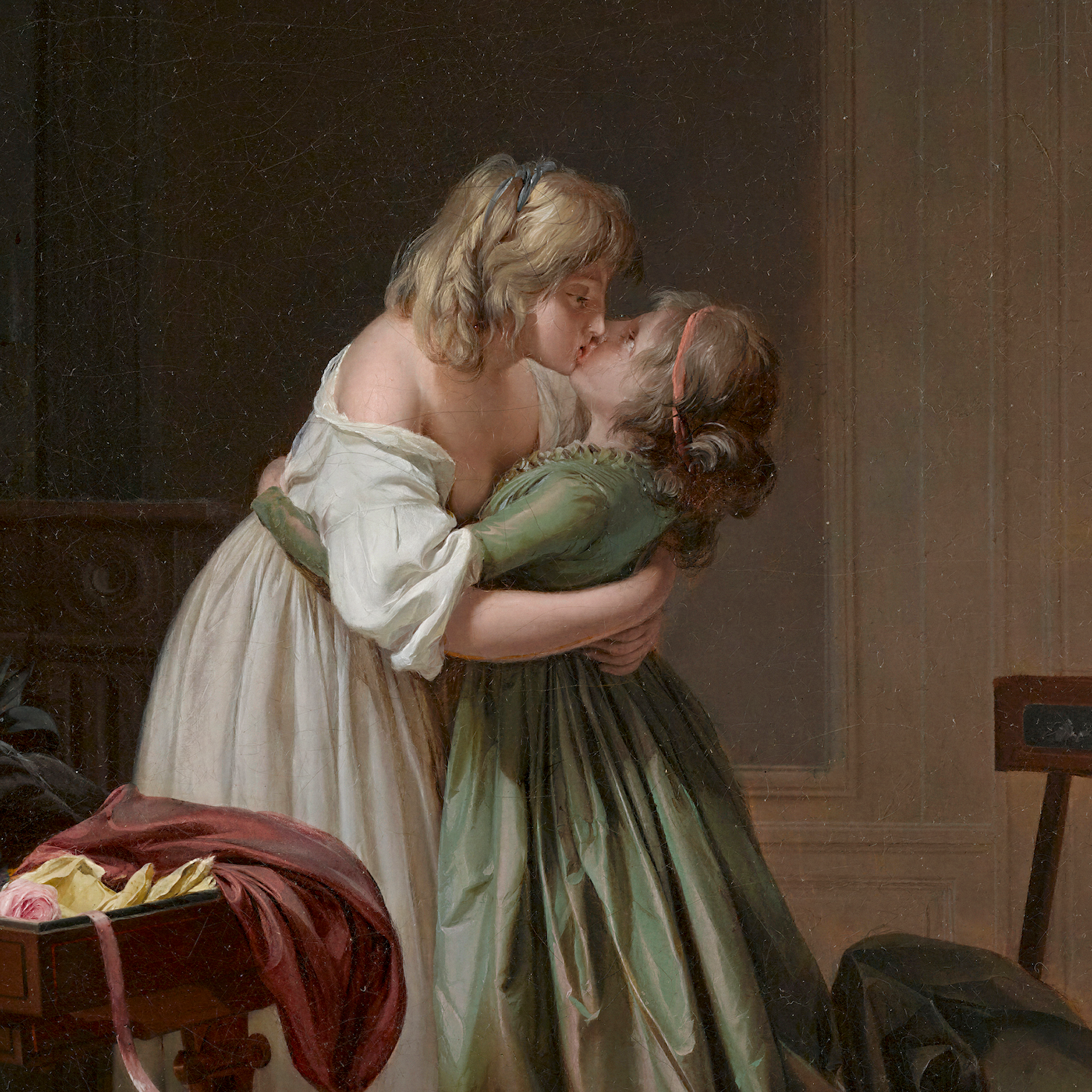 Two Young Women Kissing is a small oil on canvas genre painting by the French artist Louis-Léopold Boilly that depicts an intimate moment between two women in a quiet interior setting. Boilly’s composition captures the figures closely embracing and sharing a kiss, with detailed attention to the textures of their clothing and the intimate space around them, reflecting everyday life and private emotion in late eighteenth-century France. The work, titled in French Deux jeunes femmes s’embrassant, is notable for its gentle portrayal of affection between the women at a time when such subjects were rarely depicted, suggesting both the artist’s skill in observing human interaction and a subtle engagement with themes of love and intimacy. Boilly was a prolific painter of genre scenes before gaining later fame for his bustling depictions of Parisian street life, and this work resides in The Ramsbury Manor Foundation collection.