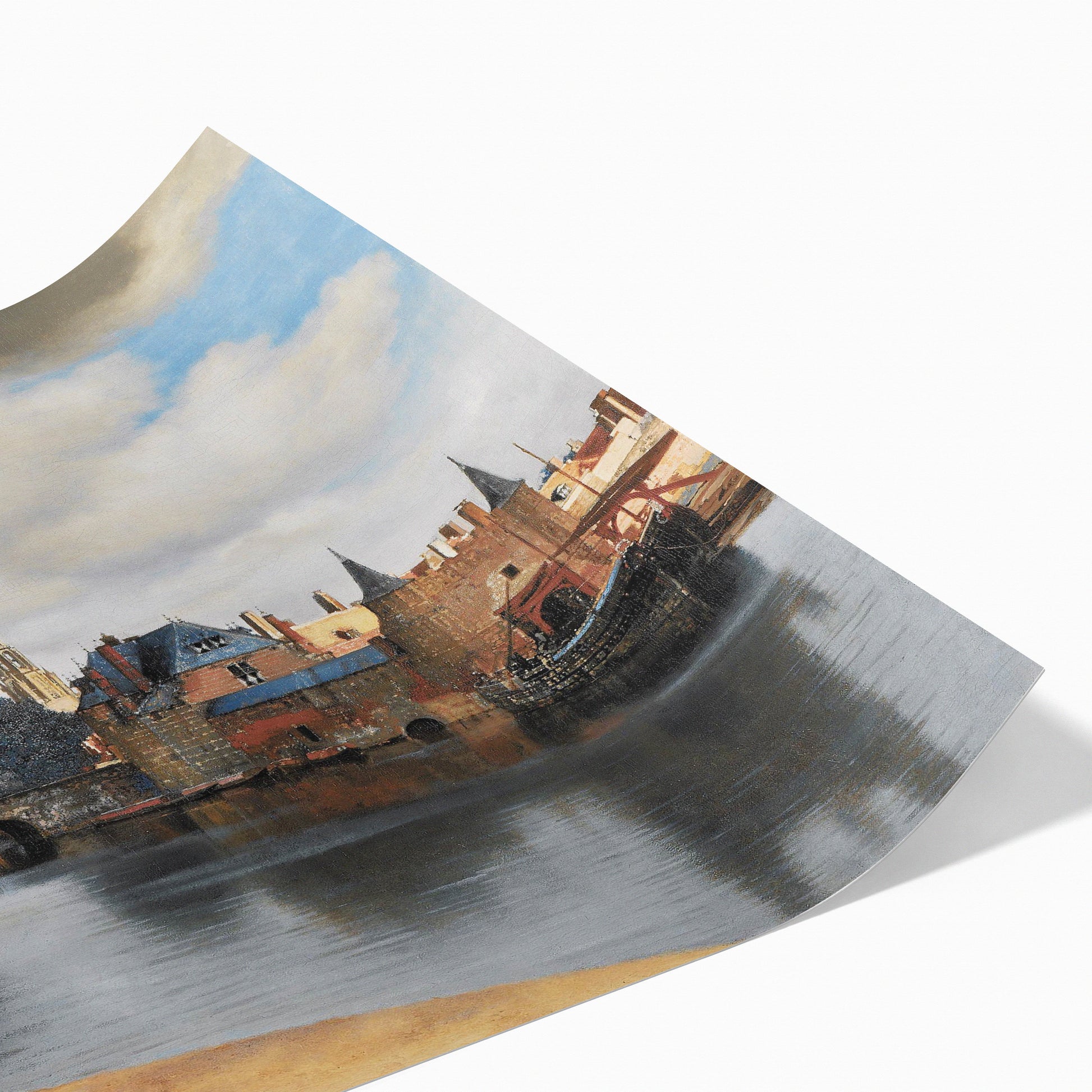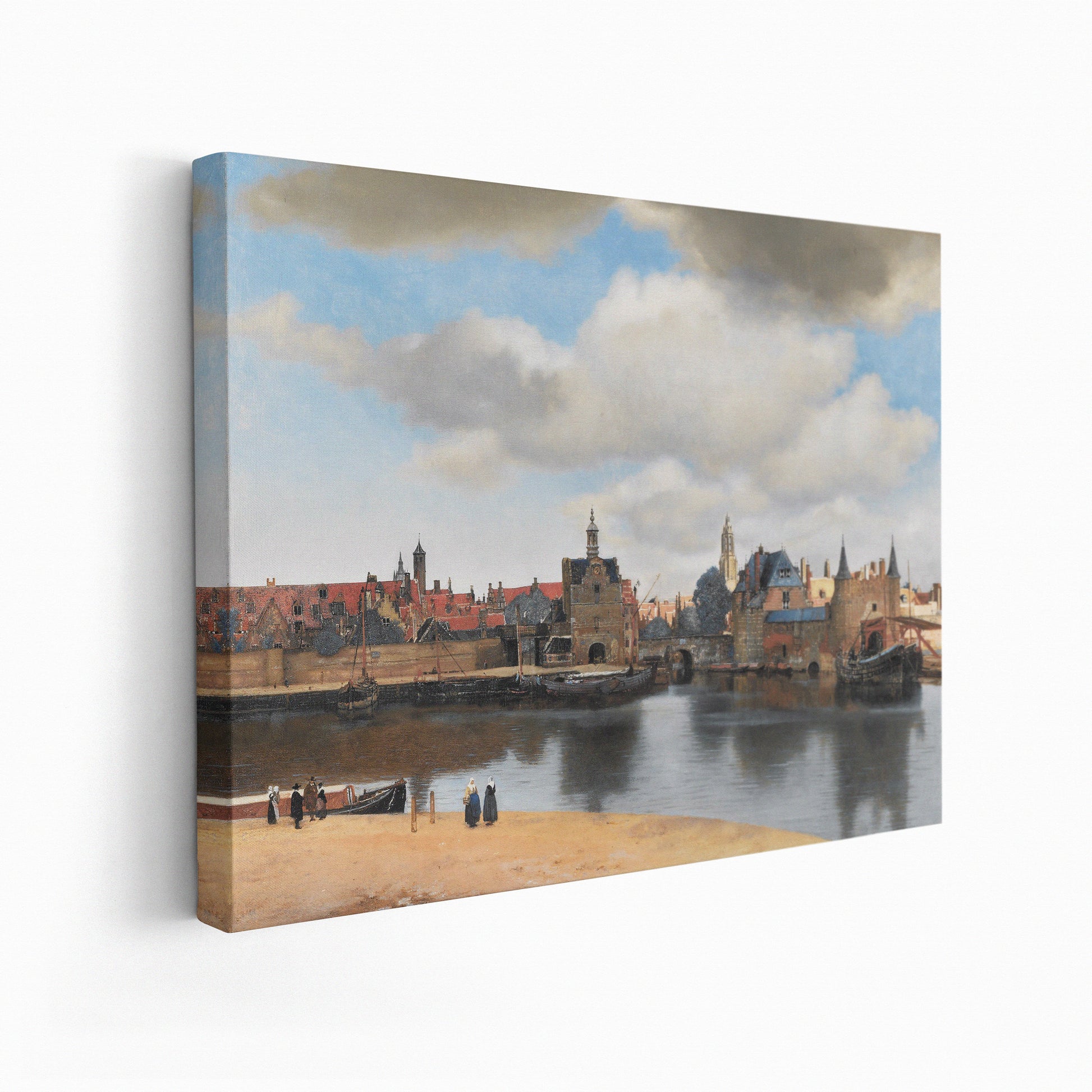 "View of Delft" by Johannes Vermeer, painted around 1660-1661, stands as a remarkable achievement in the landscape genre, offering a meticulous and luminous portrayal of the Dutch city's skyline and waterfront. Unlike his more commonly intimate interior scenes, this work presents an expansive outdoor view, capturing the essence of Delft with extraordinary clarity and detail. Vermeer's use of light and shadow, particularly in the depiction of the clouds and the reflections on the water, demonstrates his exceptional skill in manipulating natural light to enhance the realism and depth of the scene. The painting's composition, with its careful arrangement of buildings, ships, and figures, alongside the masterful rendering of atmospheric perspective, conveys a sense of calm and grandeur, making "View of Delft" not only a topographical record but also a profound expression of the beauty found in the everyday environment. This work is celebrated for its emotional impact, attributed to Vermeer's ability to infuse a landscape with a sense of momentary stillness and timeless wonder.