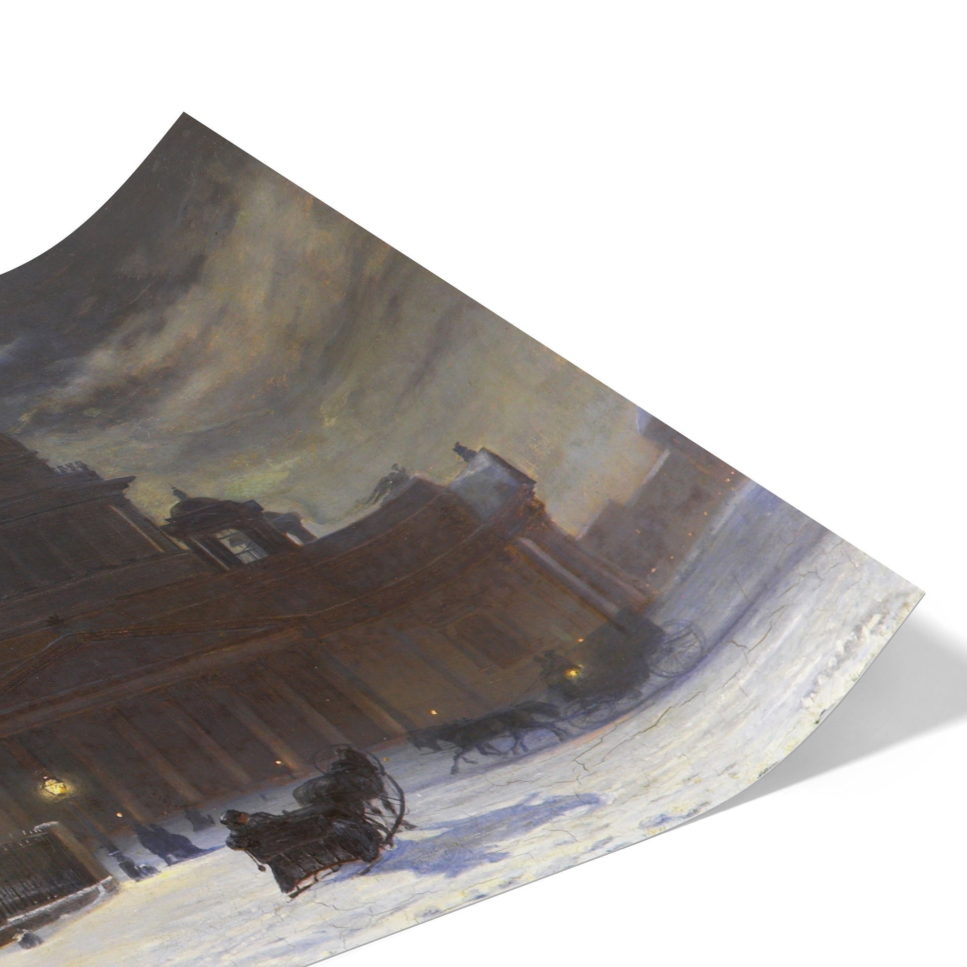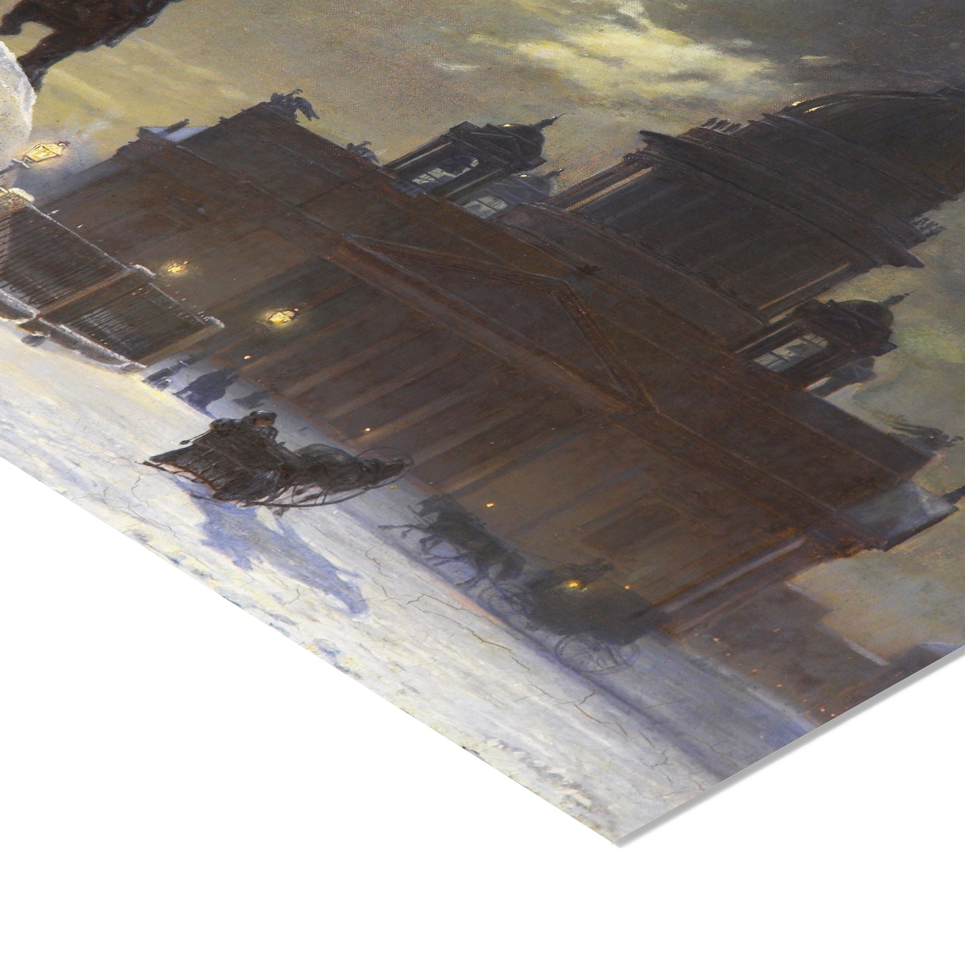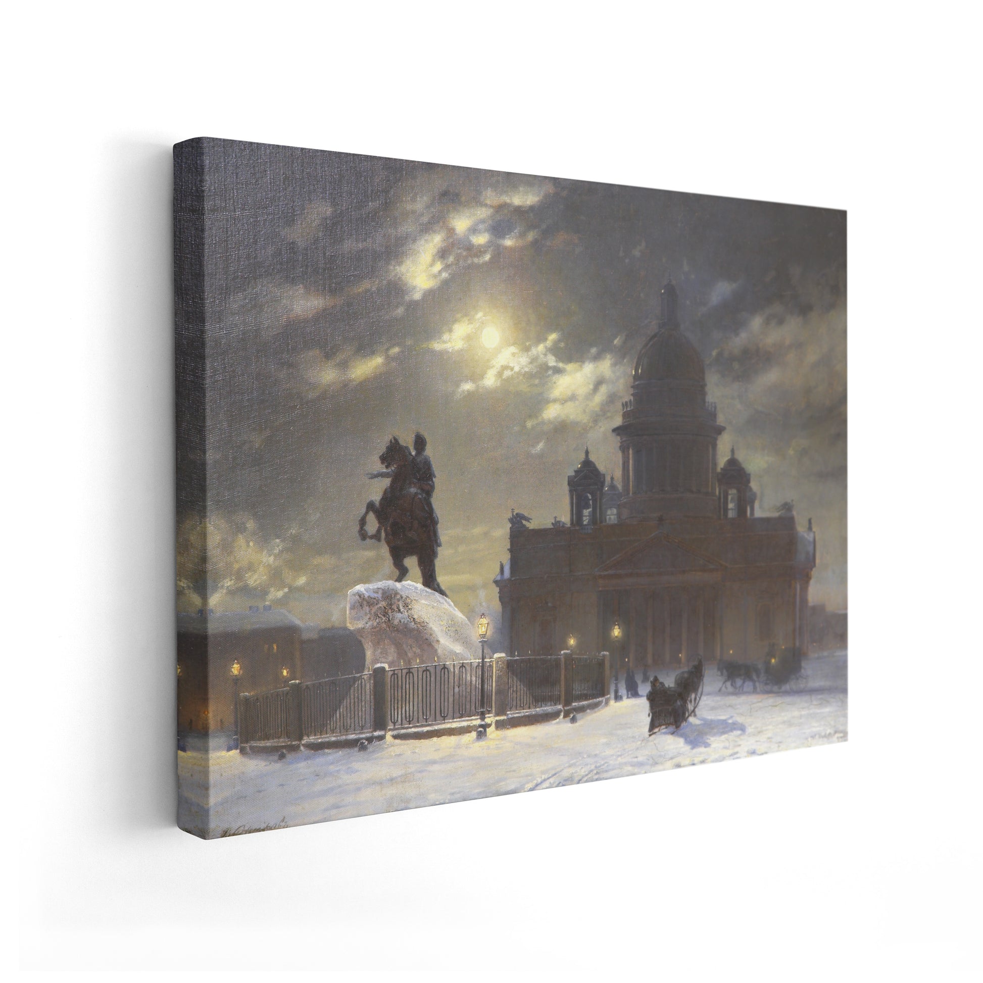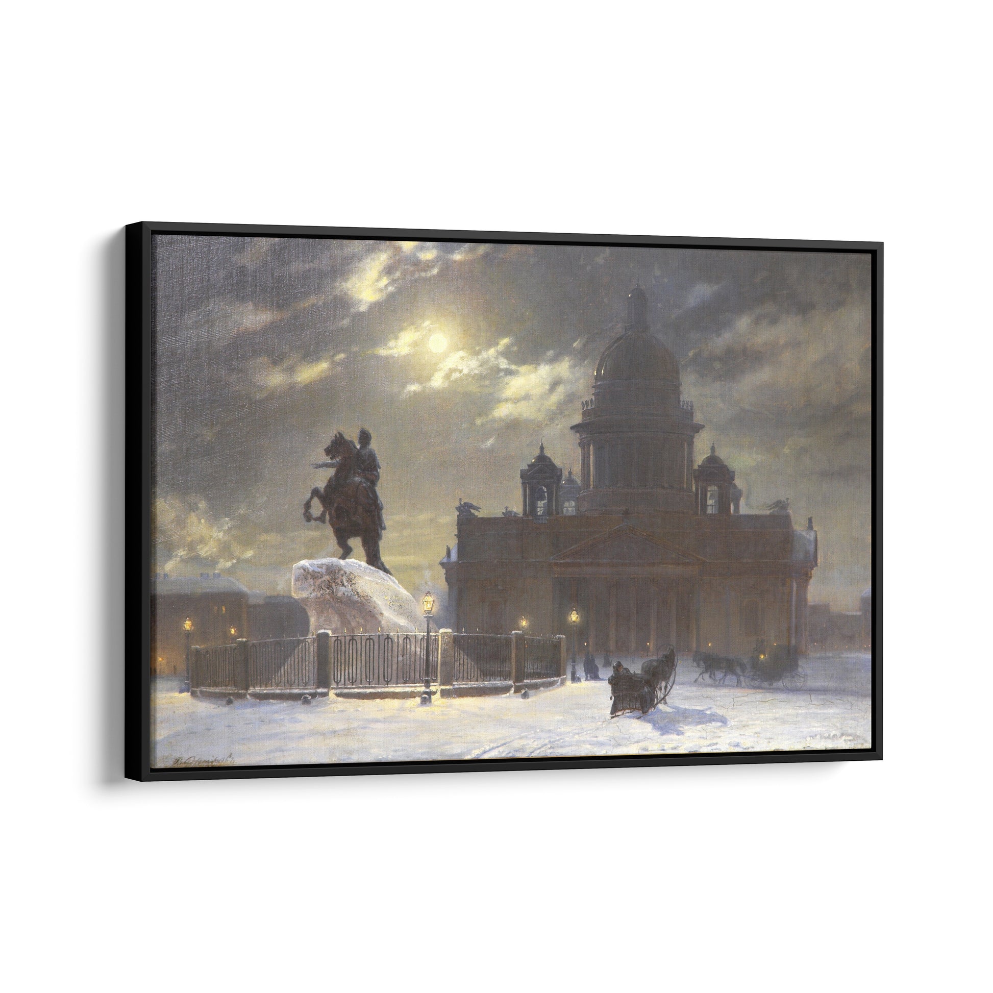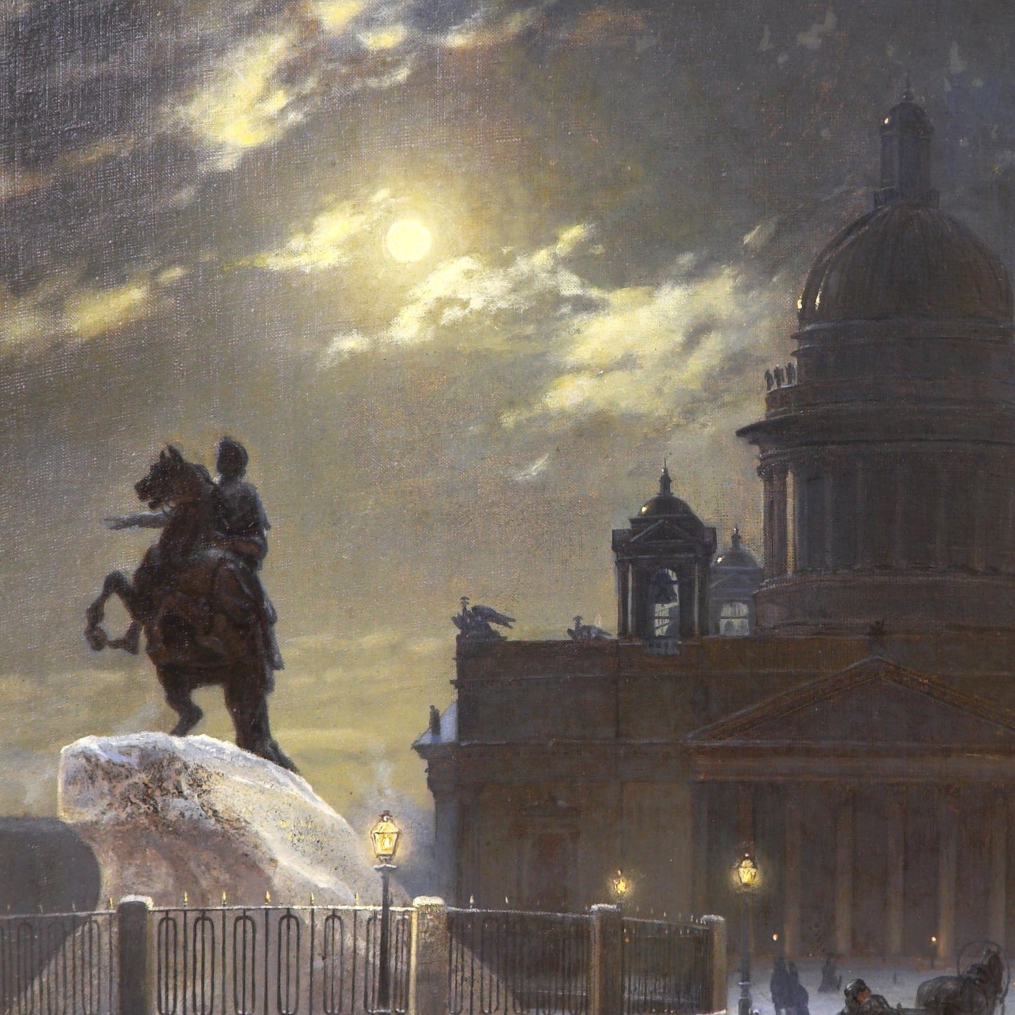 Vasily Surikov’s View of the Monument to Peter I on the Senate Square in St. Petersburg (1870) captures the imposing presence of Falconet’s famous “Bronze Horseman,” a symbol of Russia’s imperial power and modernization. Surikov situates the statue against a dramatic sky and vast square, emphasizing both its grandeur and its role as a central landmark in St. Petersburg. The composition conveys a sense of awe and reverence for Peter the Great as the visionary ruler who transformed Russia, while also highlighting the monument’s integration into the city’s identity. By painting this iconic view, Surikov not only honored Peter I but also underscored the cultural pride and historical consciousness that characterized Russian art in the late 19th century.
