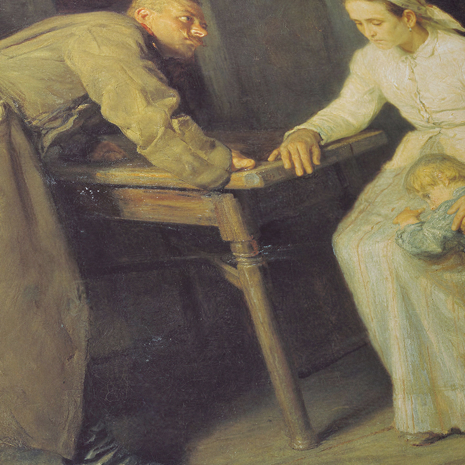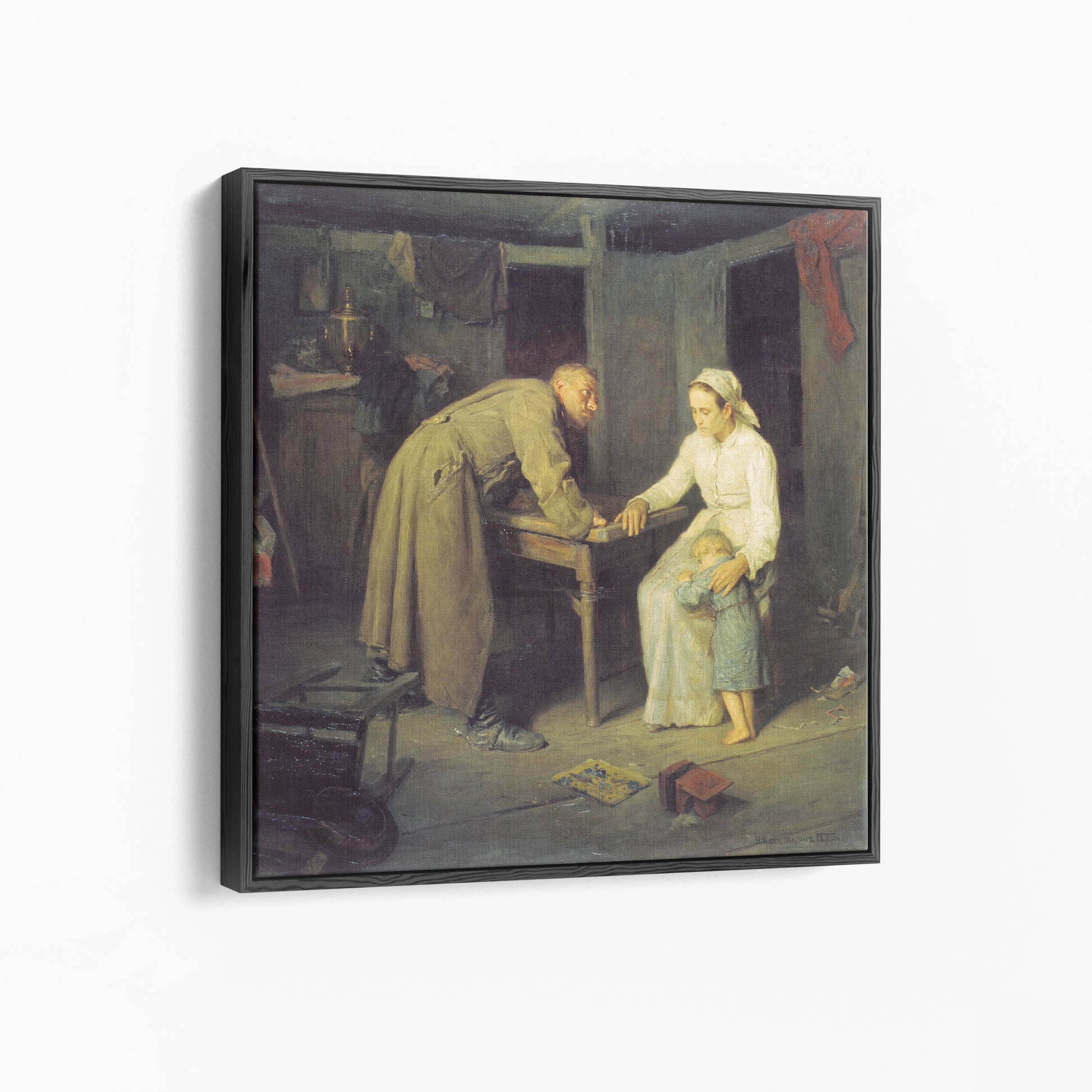 In Who? by Nikolay Kasatkin, painted in 1897, we witness a tense and intimate moment between a soldier and his wife that quietly reveals the social reality of Russia at the time, when military service could last several years. The man has just returned home after a long absence and finds a child who is clearly younger than the number of years he has been away. Instead of anger, the painting shows him leaning toward the table, asking his wife for an explanation. She stands dressed in white, a visual symbol of purity, hinting that the situation is not about infidelity but about something far more painful. Kasatkin guides us to understand that the soldier knows the child isn’t his, yet he isn’t questioning paternity. He is asking who harmed her while he was gone. The entire composition becomes a quiet plea for truth, compassion, and the unspoken tragedies that occurred in a society where women were often left alone and vulnerable during their husbands’ long years of service.