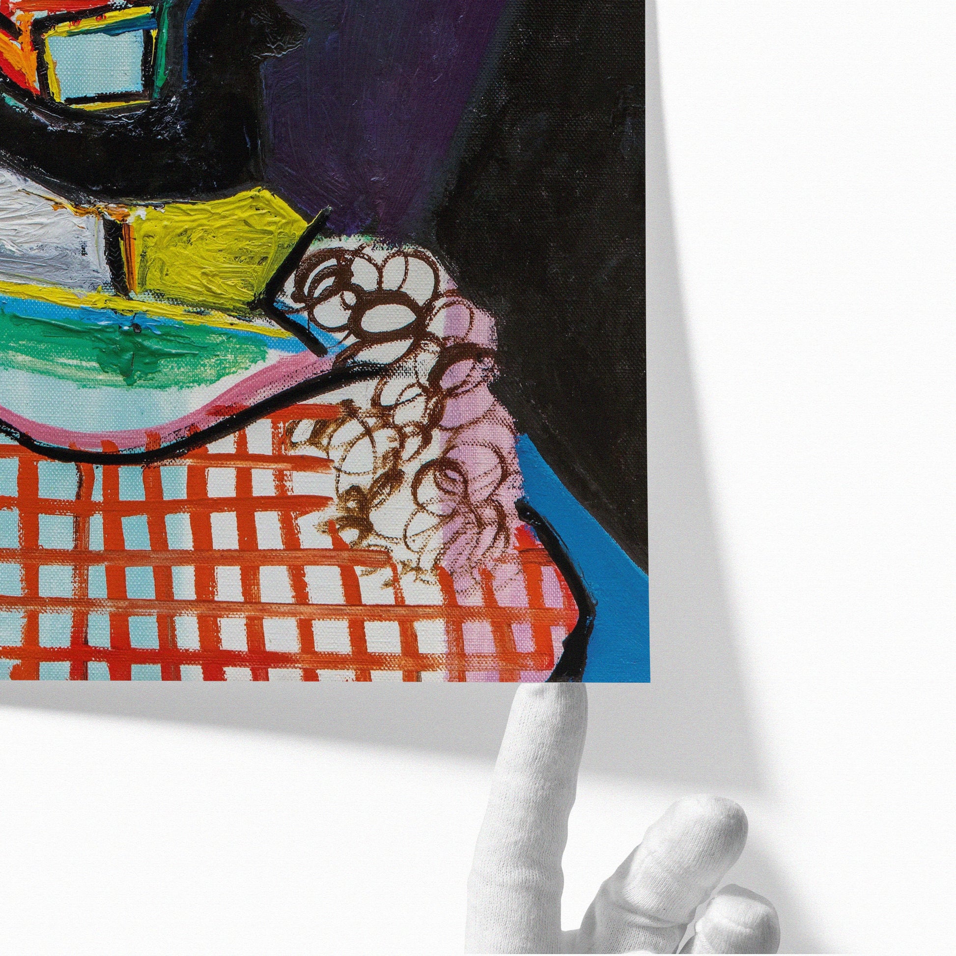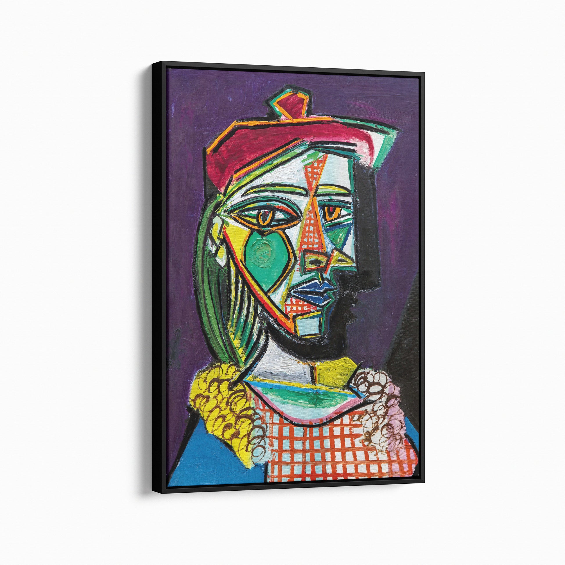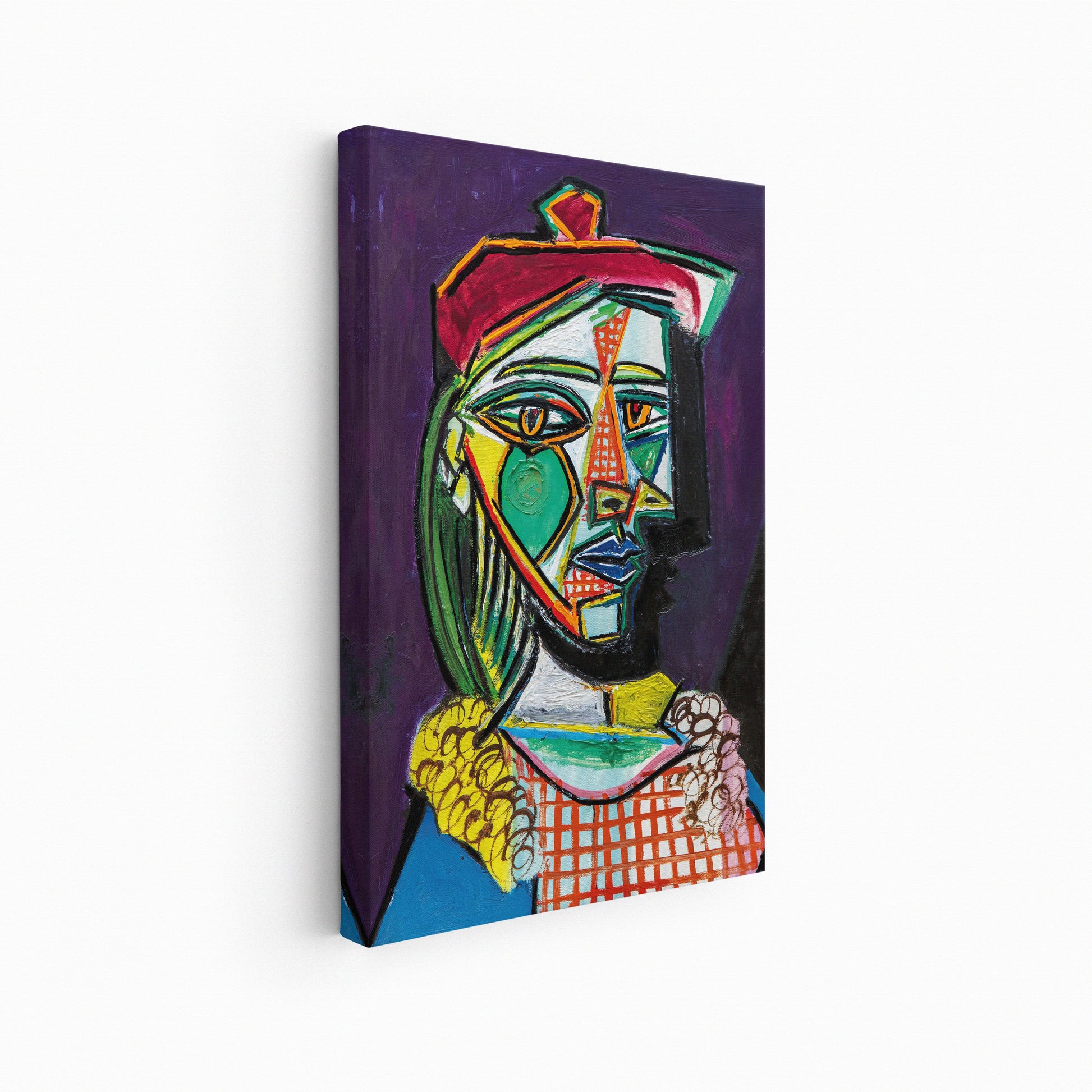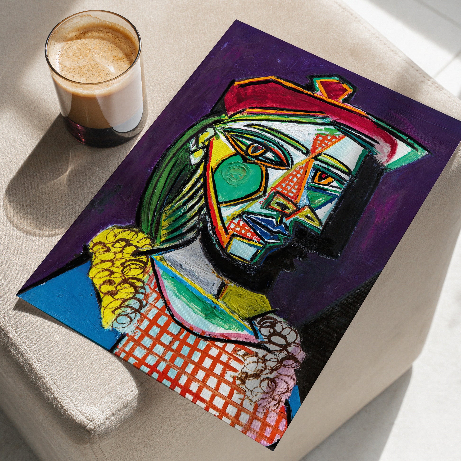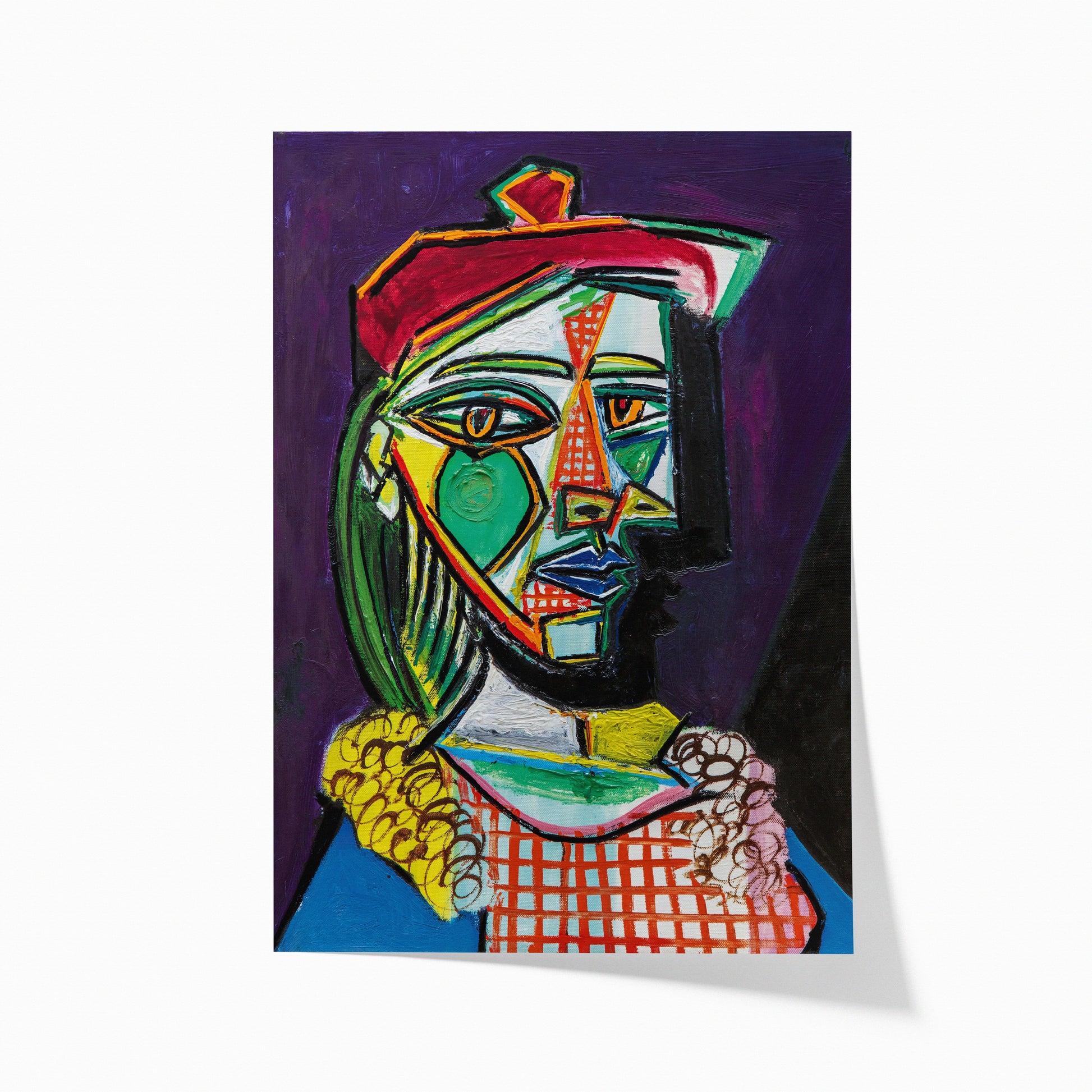 "Woman in Beret and Checked Dress" by Pablo Picasso, painted in 1937, is a vibrant and striking portrait from his surrealist period. In this captivating work, Picasso presents a woman with bold features and a sense of whimsy. The woman, rendered in a cubist-inspired style, wears a beret and a colorful checked dress that adds to the playful and dynamic composition. Picasso's use of bold lines and geometric shapes creates a sense of movement and energy, while the contrasting colors of red, blue, and yellow add to the painting's vibrancy. The woman's gaze is direct and confident, exuding a sense of self-assuredness and independence. "Woman in Beret and Checked Dress" is a celebration of femininity and individuality, capturing the essence of Picasso's surrealist exploration of form and color. The painting invites viewers into a world of imagination and possibility, where reality is transformed into a bold and vibrant expression of the human spirit.