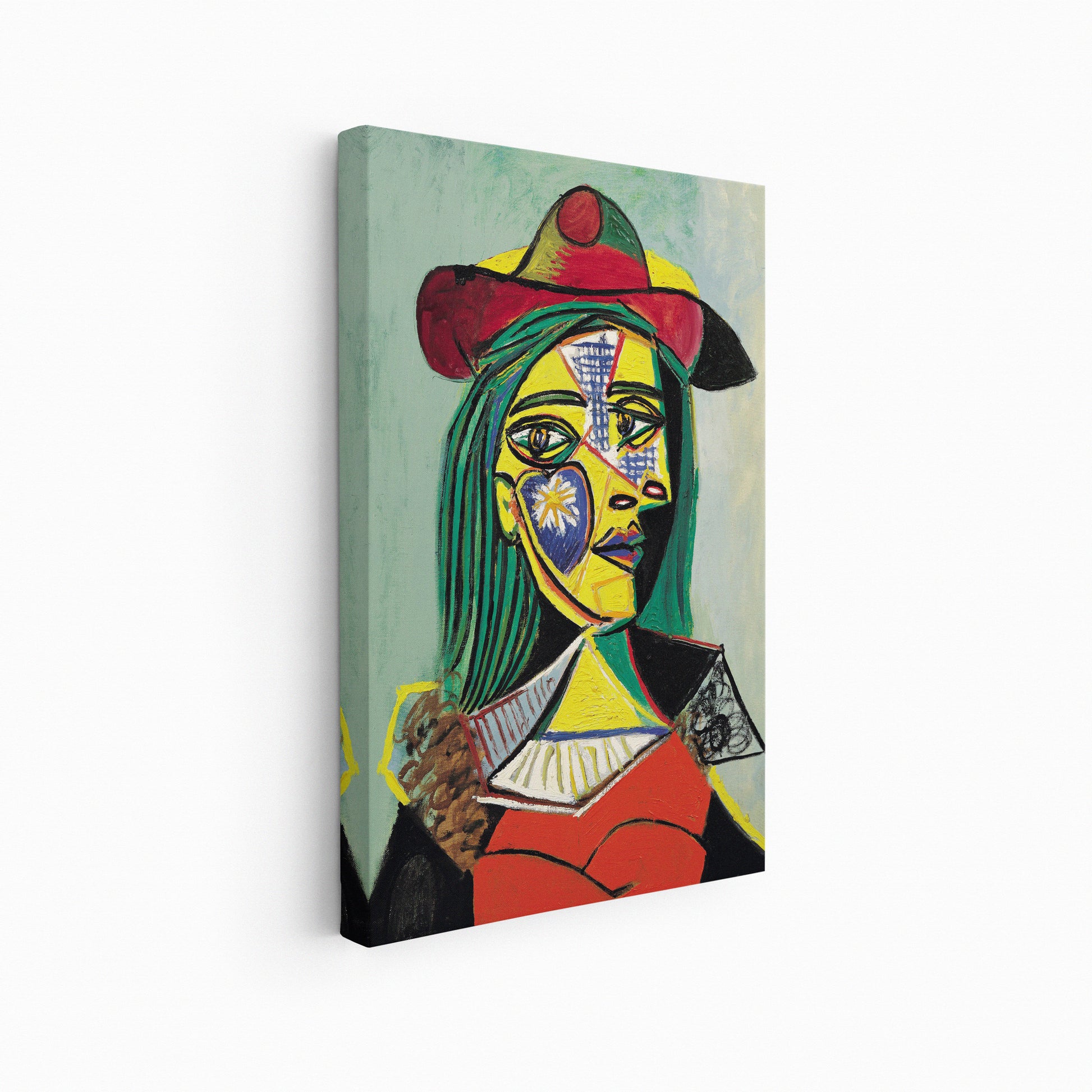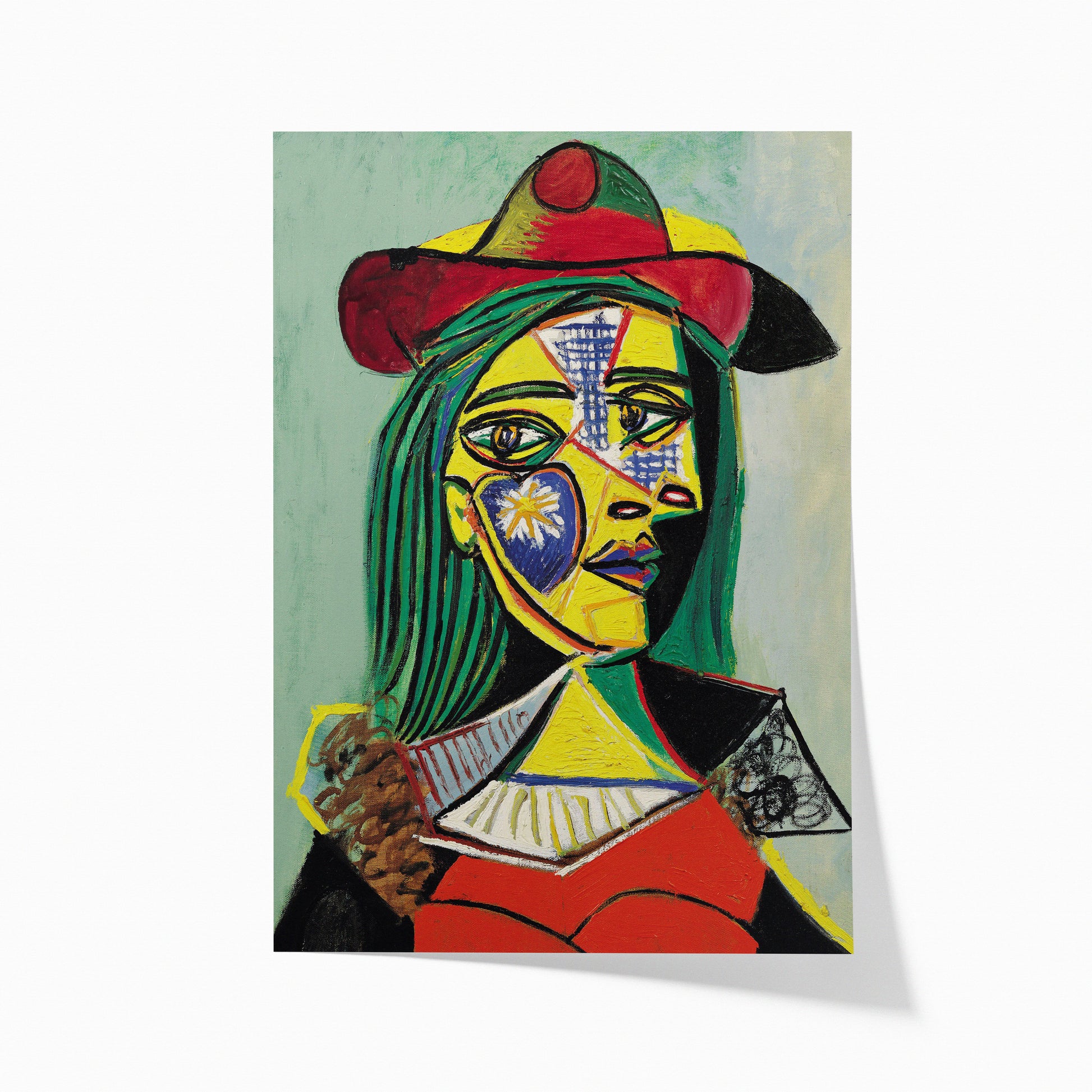 "Woman in Hat and Fur Collar" by Pablo Picasso, painted in 1937, is a striking and elegant portrait from his surrealist period. In this captivating work, Picasso presents a woman with bold features and a sense of mystery. The woman, rendered in a cubist-inspired style, wears a hat with a dramatic fur collar that frames her face with a sense of allure. Picasso's use of bold lines and geometric shapes creates a dynamic and stylized portrayal, while the contrasting colors of black, white, and gray add to the painting's sophistication. The woman's gaze is enigmatic and alluring, inviting viewers to ponder the secrets behind her expression. "Woman in Hat and Fur Collar" is a captivating exploration of femininity and intrigue, capturing the essence of Picasso's surrealist vision. The painting invites viewers into a world of enigma and sophistication, where reality is transformed into a bold and captivating portrait of the human spirit.