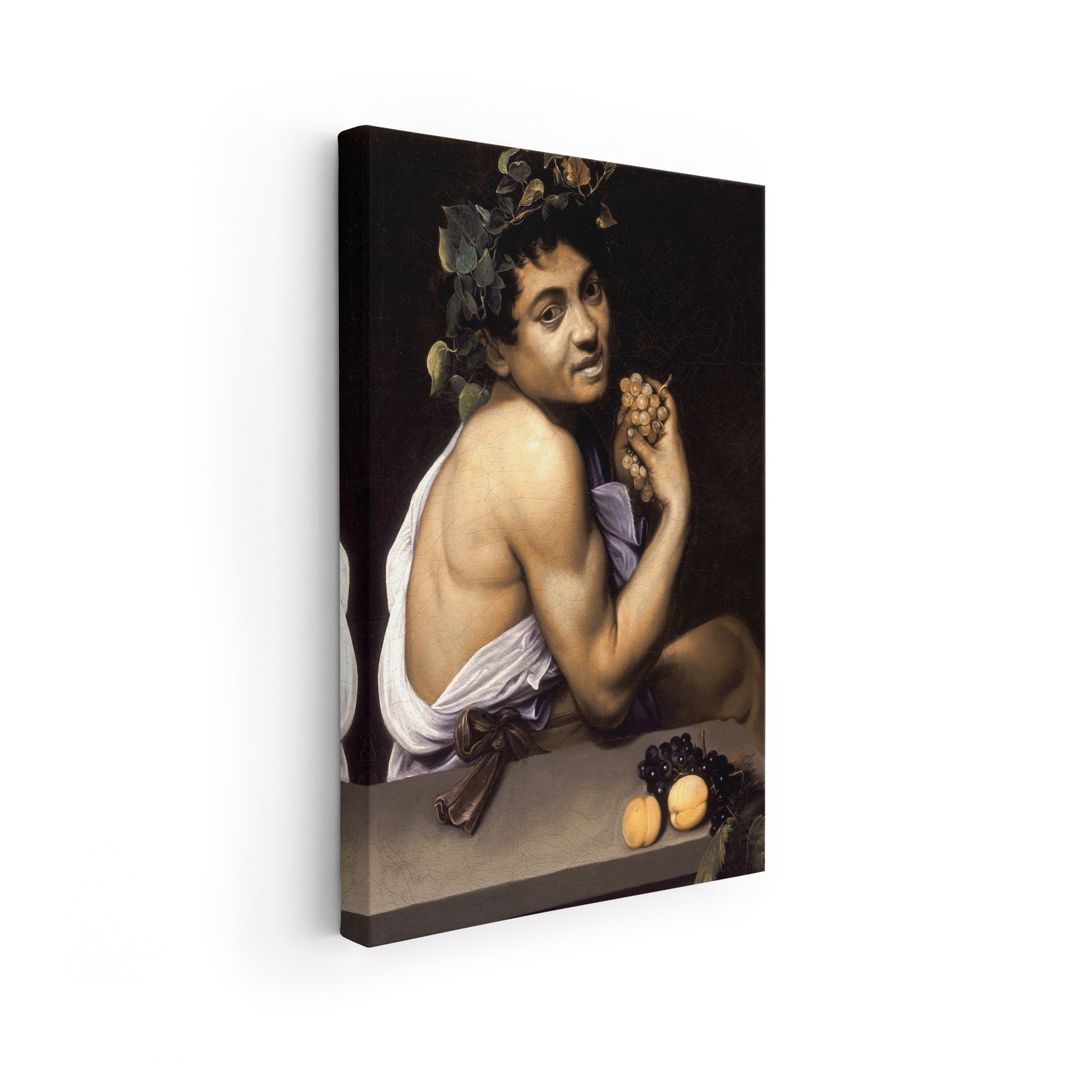 Caravaggio’s Young Sick Bacchus (1593) is a striking early self-portrait in which the artist depicts himself as the god of wine, but with a frailty that undermines divine vitality. Painted shortly after his own recovery from illness, the work shows a pale, almost greenish youth crowned with vine leaves, holding a cluster of grapes with languid detachment. His lips are discolored, his eyes heavy, and his body carries the unmistakable weight of convalescence. Unlike the exuberant Bacchus of classical tradition, this figure embodies mortality and vulnerability, blurring the line between myth and lived experience. Caravaggio transforms the god of revelry into a symbol of decay and human fragility, while also asserting his own presence as both subject and storyteller—a raw, intimate glimpse of the artist’s early realism and personal suffering.